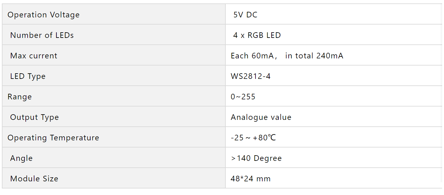 RGB LED module: contains four RGB LED color lights. Each LED can be red(R)、green(G)、blue(B) through numbers. RGB LED has integrated control chips inside, one signal cable can realize the independent full-color function. It has the feature of high brightness and adjustable, achieves the rainbow lights, meteor lights, etc. By using the RJ11 standard interface, it can connect to any black interface on the main board of Robobloq Robots, and show its name after connecting to PC.